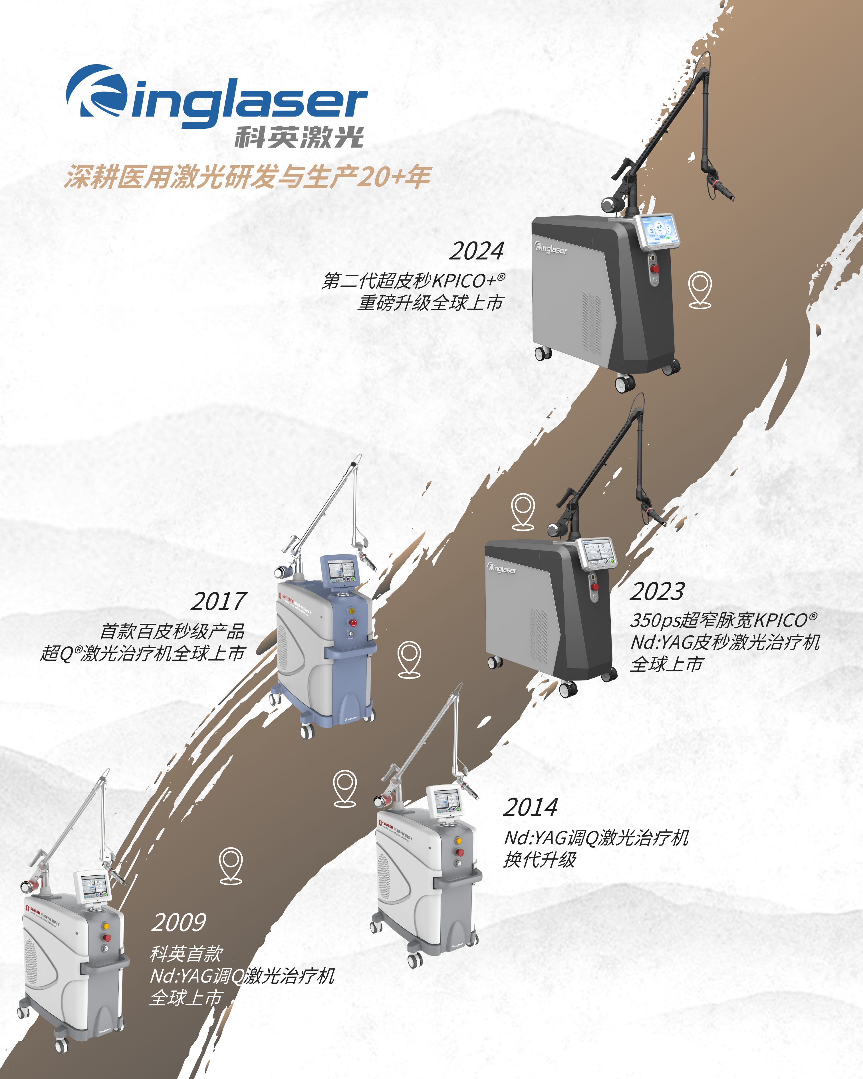 科英激光成立于2003年,二十余年來專注于激光技術(shù)在醫(yī)學(xué)領(lǐng)域的應(yīng)用。公司自2009年在全球首次上市Nd:YAG調(diào)Q激光治療機以來,產(chǎn)品不斷升級改進,在2014年迎來升級換代后,又于2017年推出科英首款百皮秒級產(chǎn)品超Q®激光治療機銷往海內(nèi)外,并在2023年成功上市科英首款350ps超窄脈寬KPICO®Nd:YAG皮秒激光治療機。此次完成重大升級的第二代超皮秒KPICO+®,實現(xiàn)了集1064nm、532nm雙波長于一體,在延續(xù)科英相關(guān)產(chǎn)品多年積累的技術(shù)路線、工藝質(zhì)量控制的基礎(chǔ)上,旨在持續(xù)為國內(nèi)醫(yī)療機構(gòu)提供適合中國市場的高端醫(yī)療設(shè)備。