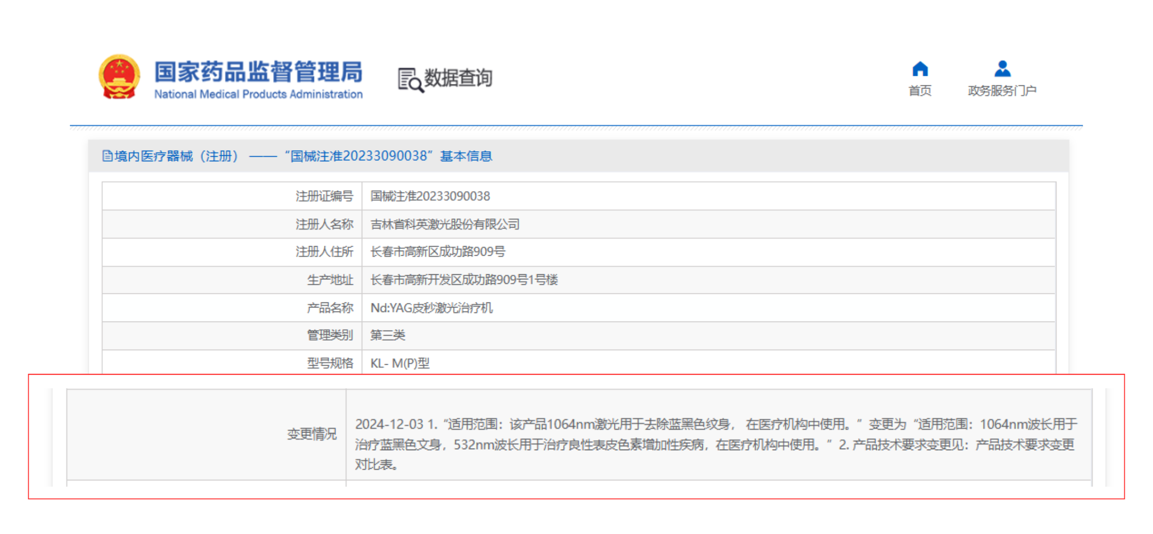 2024年12月3日,科英激光Nd:YAG皮秒激光治療機重磅升級獲得國家藥品監(jiān)督管理局注冊批準,在原有型號基礎(chǔ)上新增532nm波段,用于治療良性表皮色素增加性疾病,從而更好服務(wù)臨床治療需求。